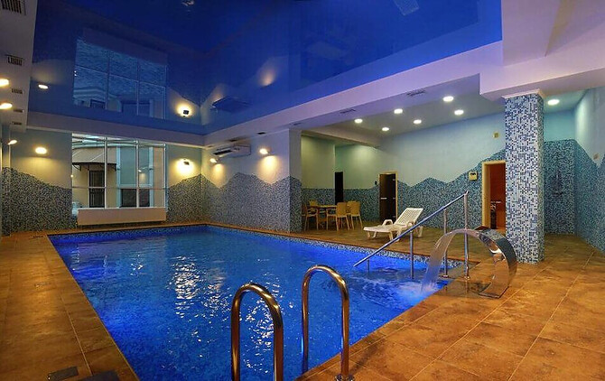 - Спа-комплекс с крытым бассейном (9×5 м, подогреваемый, с противотоком и водопадом) — бассейн входит в стоимость проживания.